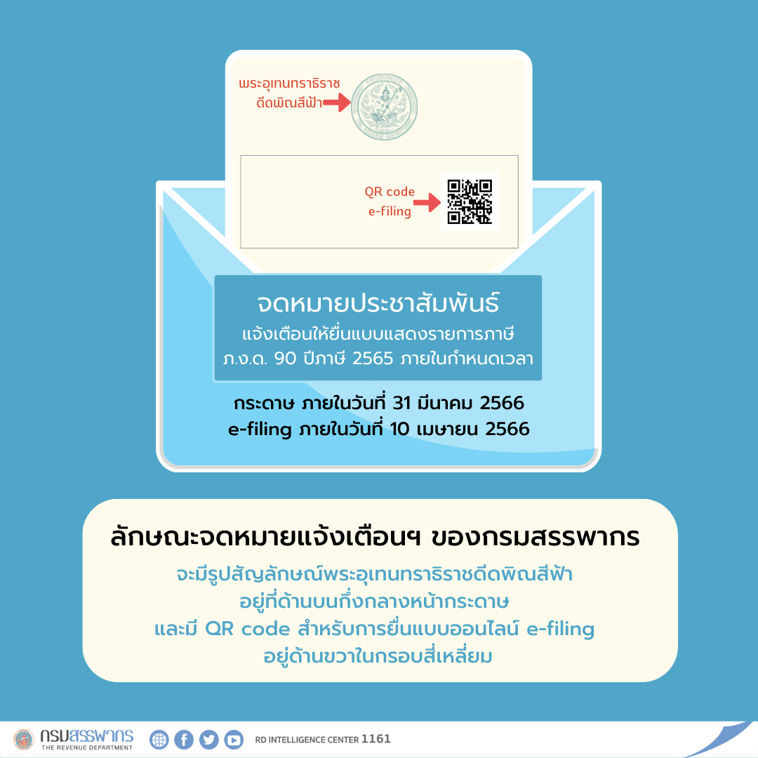 ขณะนี้กรมสรรพากรได้ดำเนินการส่งจดหมายแจ้งเตือนการยื่นแบบแสดงรายการภาษีเงินได้บุคคลธรรมดา ภ.ง.ด.90 ปีภาษี 2565