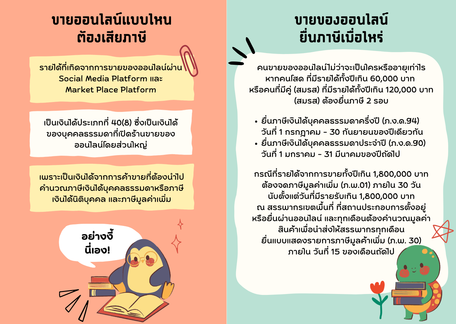 ในปัจจุบันการขายของออนไลน์กำลังเป็นที่นิยม ซึ่งพ่อค้าแม่ค้าได้ขายสินค้าผ่านแพลตฟอร์มต่างๆมากมาย ไม่ว่าจะเป็น Facebook, Instagram, Shopee, Lazada, TikTok, Grab, Line Man เป็นต้น ซึ่งรายได้จากการขายของออนไลน์นั้น จำเป็นต้องยื่นและเสียภาษีอย่างถูกต้อง