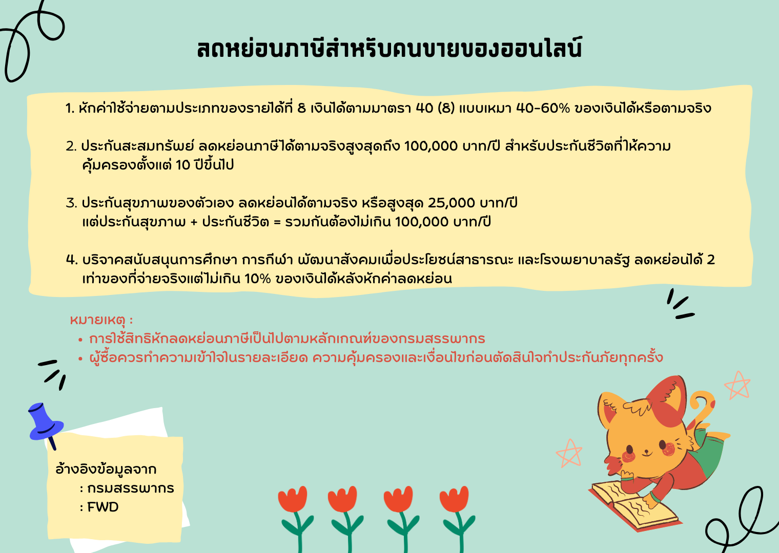 พ่อค้าแม่ค้าออนไลน์สามารถวางแผนลดหย่อนภาษีด้วยประกันสุขภาพที่นอกจากจะได้ความคุ้มครองกรณีเจ็บป่วยแล้ว ยังนำไปลดหย่อนภาษีได้อีกด้วย อย่างประกันสุขภาพออนไลน์ Easy E-Health ประกันที่เหมาจ่ายค่ารักษาให้ตามจริงสูงสุด 1,500,000 บาท พร้อมค่ารักษาผู้ป่วยนอก OPD (ขึ้นอยู่กับแผนความคุ้มครองที่เลือก) และยังสามารถนำเบี้ยประกันภัยในส่วนคุ้มครองชีวิตไปลดหย่อนภาษีได้สูงสุด 100,000 บาท และเบี้ยประกันภัยสุขภาพหักลดหย่อนภาษีได้สูงสุด 25,000 บาท (รวมกันแล้วต้องไม่เกิน 100,000 บาท) ได้อีกด้วย